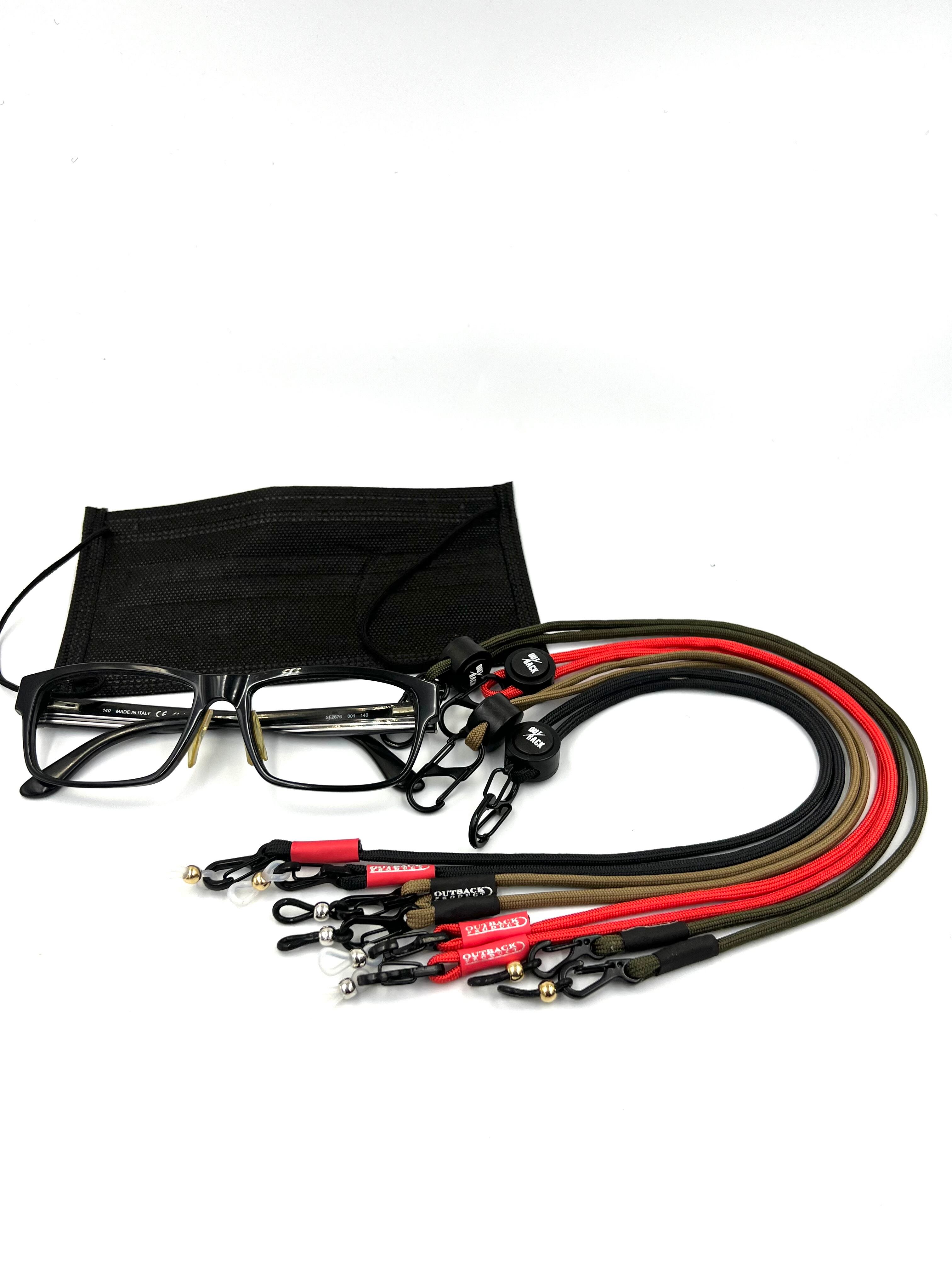 マスクストラップ、メガネストラップ、ロングパラコードカラビナの3wayで使用可能なストラップになります